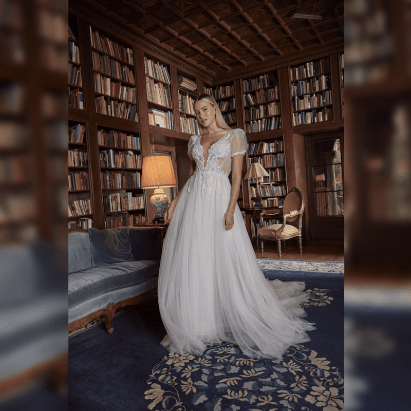 A-Line with Puff Sleeves Plunging Neckline & Shear Bodice
