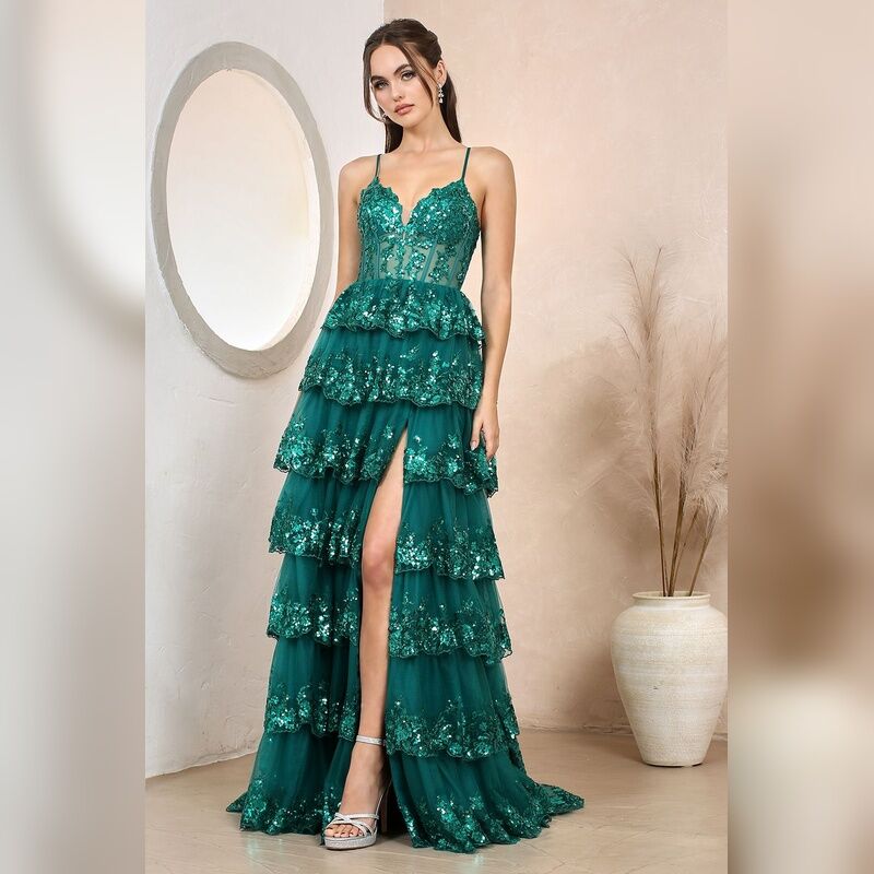 A-Line Slit Gown with Tiered Sleeveless Applique Design