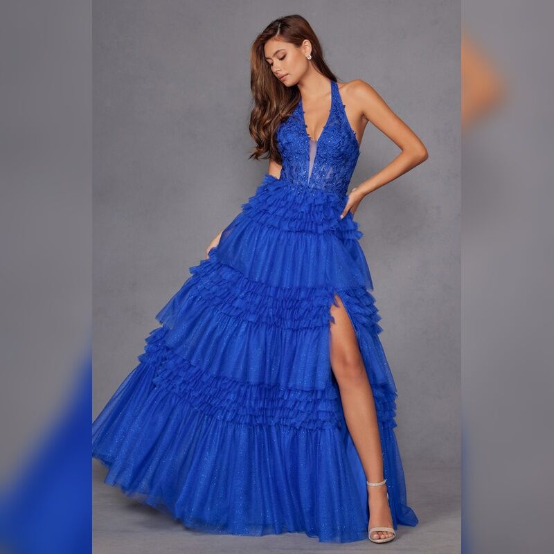 Halter Ruffled A-line Slit Gown by Juliet