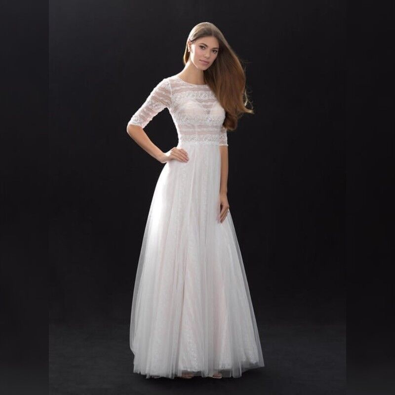 Sheer Banded Lace Forms the Bodice and Elbow-Length Sleeves of this Soft A-Line Gown.